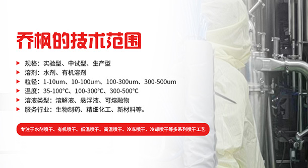 上海喬楓實業有限公司,成立于2012年,是從事噴霧干燥設備的研發設計、生產、銷售(小型噴霧干燥機,實驗型噴霧干燥機,35℃低溫噴霧干燥機,有機溶劑噴霧干燥機低溫閉式循環噴霧干燥機超細粉末噴霧干燥機、噴霧冷凍干燥機、真空噴霧干燥機氣流噴霧干燥機噴霧造粒干燥機,離心噴霧干燥機沸騰制粒機等)和售后于一體的綜合性公司,本公司現成為一家致力于為生物制藥、精細化工、新能源、陶瓷造粒及食品工程等領域提供全套解決方案的整線交鑰匙工程企業。